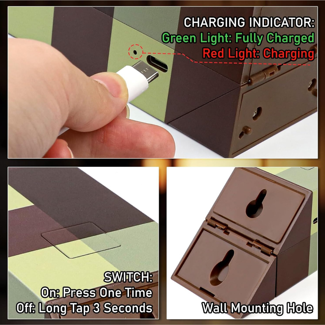 Recharge easily with the included USB cable and enjoy long-lasting battery life. Hours of vibrant blocky lighting for gaming sessions, parties, or room decoration. Never run out of Minecraft glow during your adventures.”